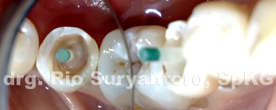 Gambar 18. Sementasi pasak fiber menggunakan semen resin self adhesive dual cured.