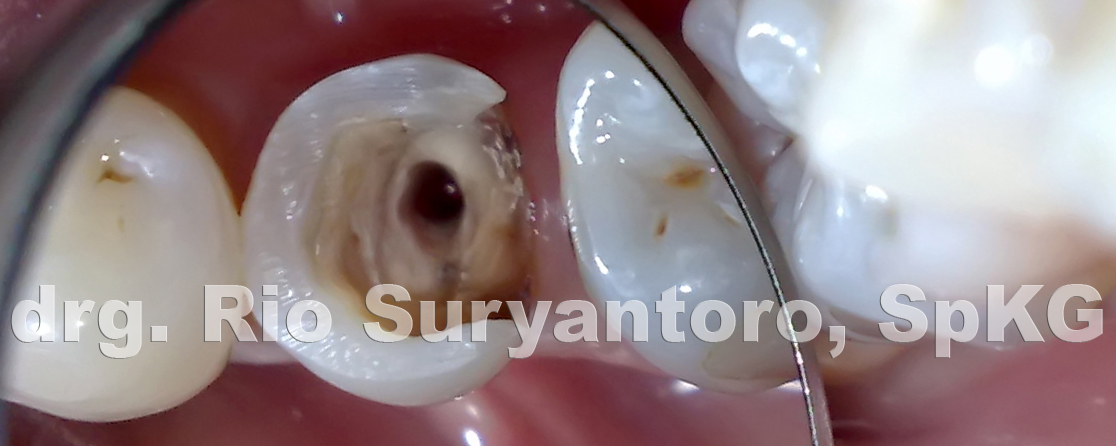 gambar 6. keadaan gigi 16 setelah dipreparasi lagi sampai semua jaringan karies hilang meninggalkan dentin sehat.